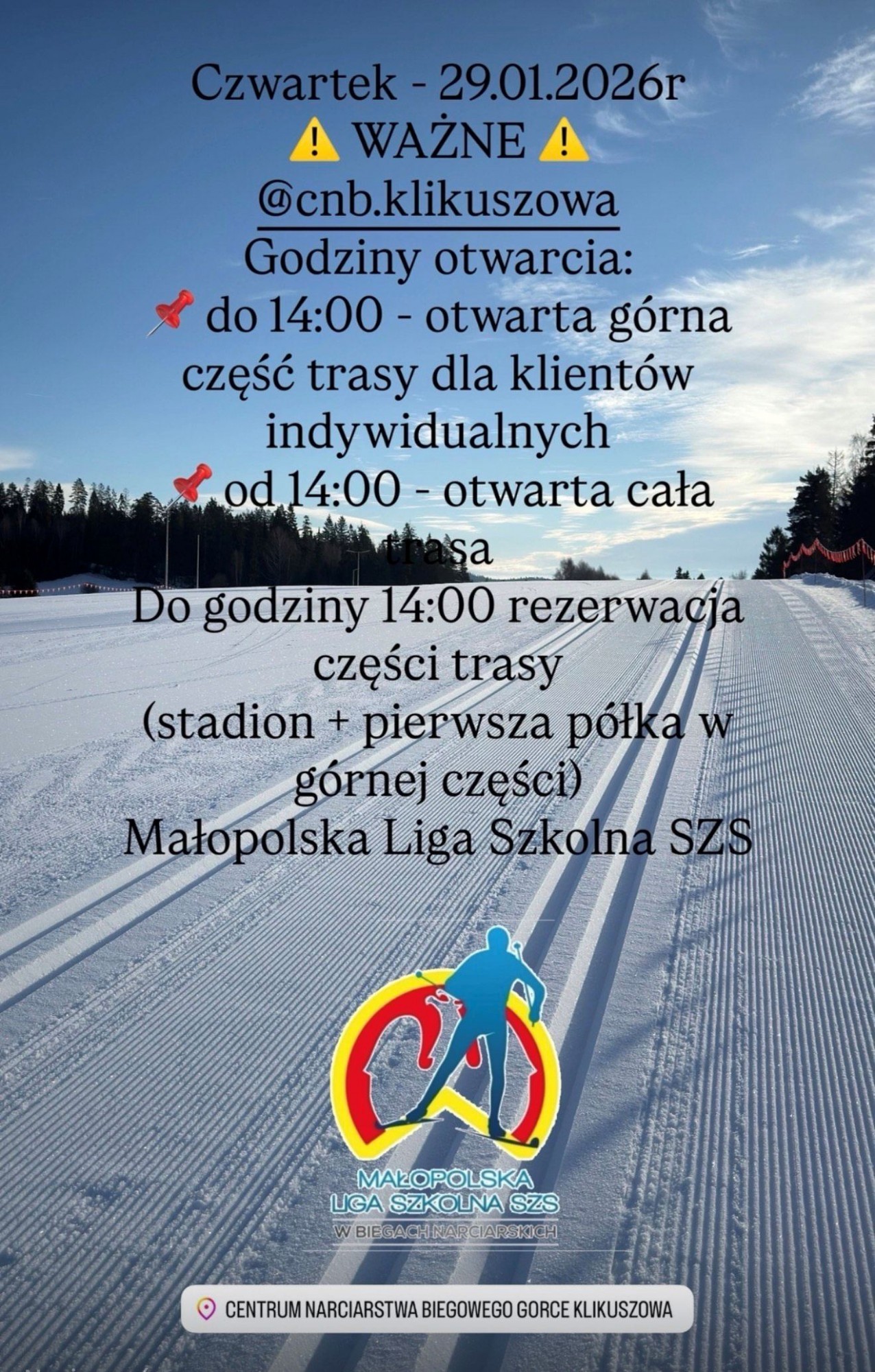 W dniu 29.01.2026r., trasa CNB Klikuszowa, do godziny 14:00 otwarta tylko w górnej części dla klientów indywidualnych o długości 1km. po godzinie 14:00 otwarta cała trasa. Do godziny 14:00 rezerwacja stadionu oraz pierwszej półki przez Małopolską Ligę Szkolną SZS w biegach narciarskich.